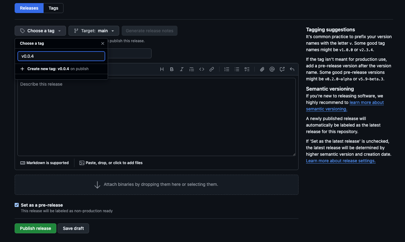 NOTE: the release format only works in the format described in the screenshot below aka vX.Y.Z. Make sure to put v (lowercase) in front of the tag version!